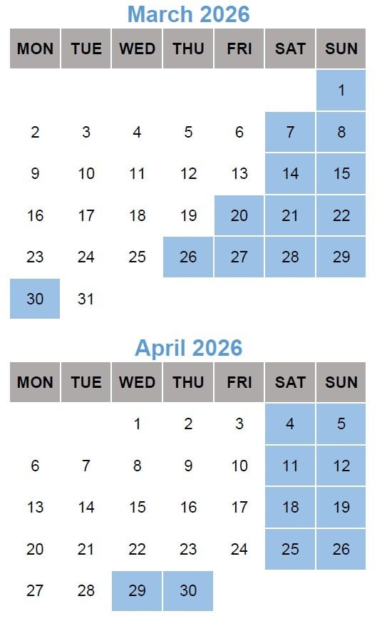 ※色がついているところが休業日です。